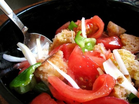 En un tazón grande, mezcle los cubos de pan con tomate, la cebolla de verdeo y la albahaca.